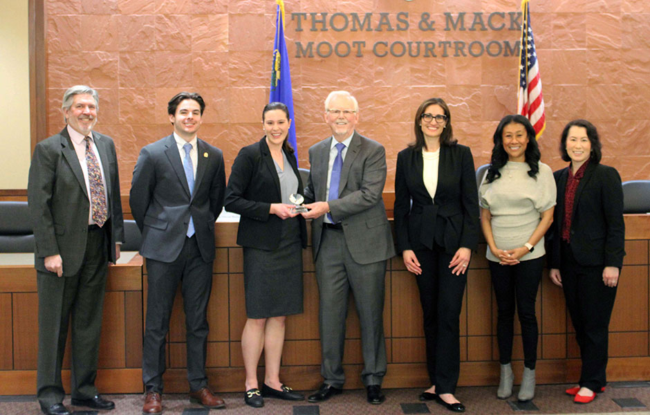 Forty attorneys and judges from Nevada’s legal community served as judges during the preliminary rounds. The final round panel featured Nevada Supreme Court Justice Patricia Lee, Nevada Court of Appeals Judge Deborah L. Westbrook, Scott Scherer — Shareholder at Brownstein and former member of the Nevada Gaming Control Board — and Boyd Law Dean Leah Chan Grinvald. Frank A. Schreck presented the Finalist Award to Christo Fosse and Madison Hollander of the University of Cincinnati College of Law.