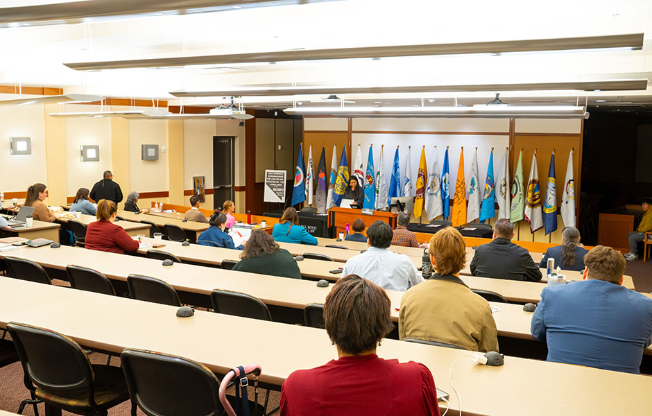 The final panel, moderated by Professor Addie Rolnick, the Yuhaaviatam of San Manuel Professor of Law, looked ahead to the program’s next chapter. Panelists included Professor Danielle Finn, students Aidan McNulty (’27) and Celina Stops (’26), and Jennifer R. Leal, founder of Field of Tribal Courts. Their discussion showcased the program’s commitment to mentorship, practical training, and elevating Native voices in law and policy.